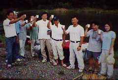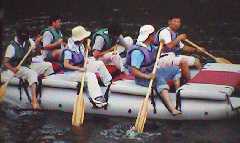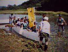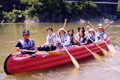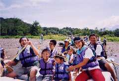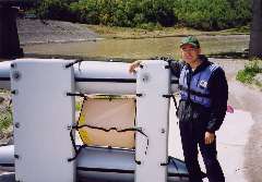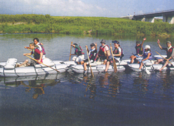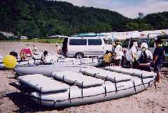 エア入れに大人二人で約30分かかります(やや重労働)。 2002年の富士川下り交流会で乗船しました。 カラリ3000と4500を連結すれば、10人乗りのEボート? |